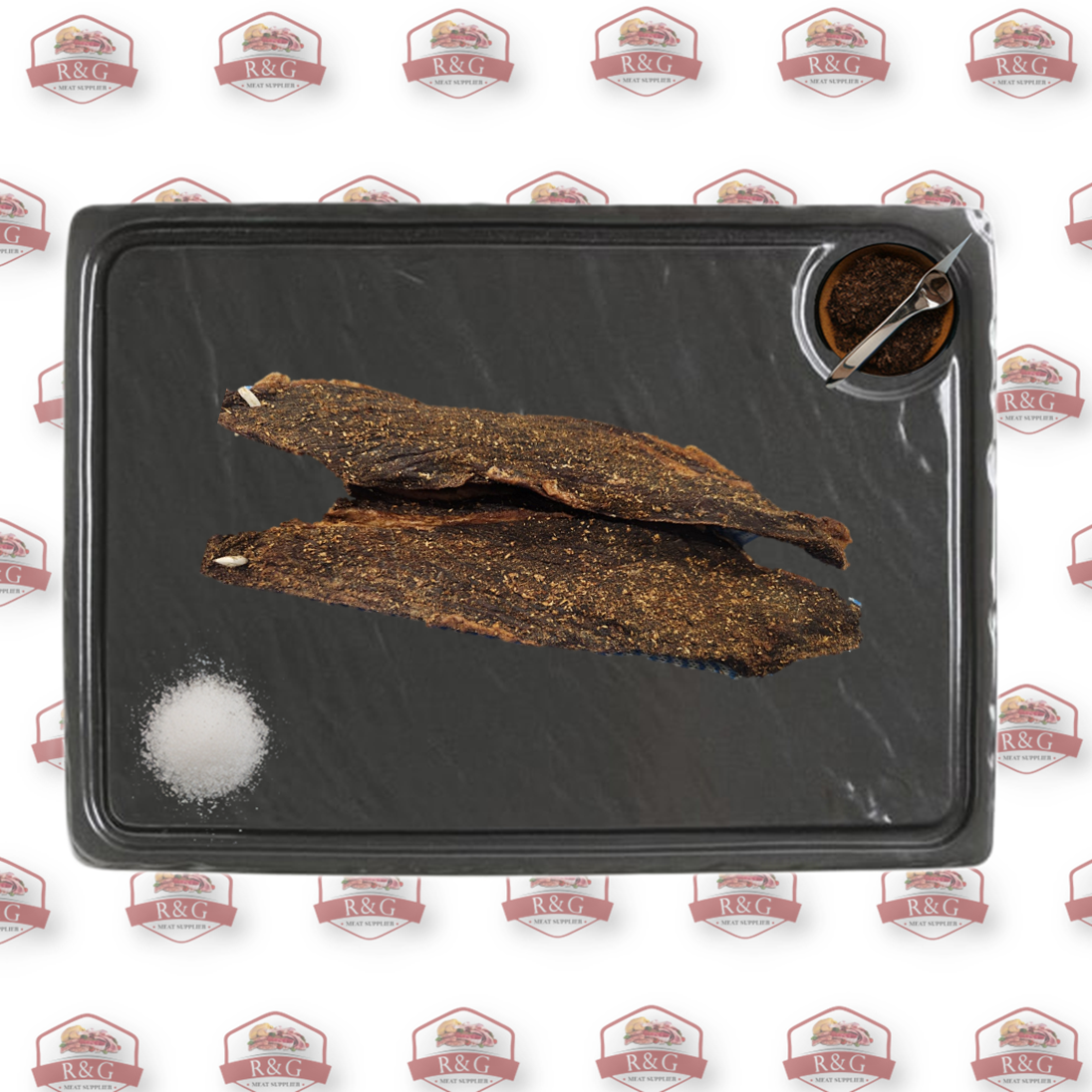 Savor the robust flavors of our game biltong, made from high-quality game meats such as venison or boar. This traditional South African snack is carefully cured and air-dried to preserve its natural taste and texture. Each bite offers a satisfying chew, packed with protein and rich, savory notes that are perfect for on-the-go snacking or as part of a charcuterie board. Whether enjoyed during outdoor adventures, sports events, or simply as a tasty treat, game biltong is an exciting option for those seeking something different and flavorful.